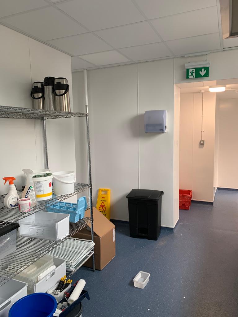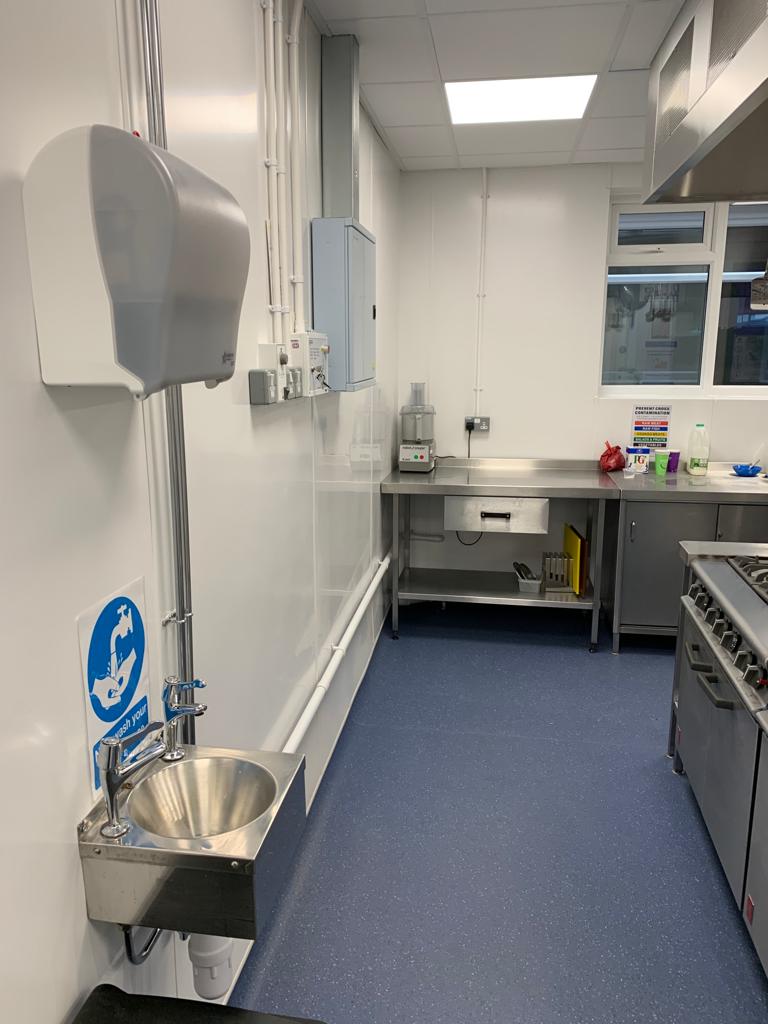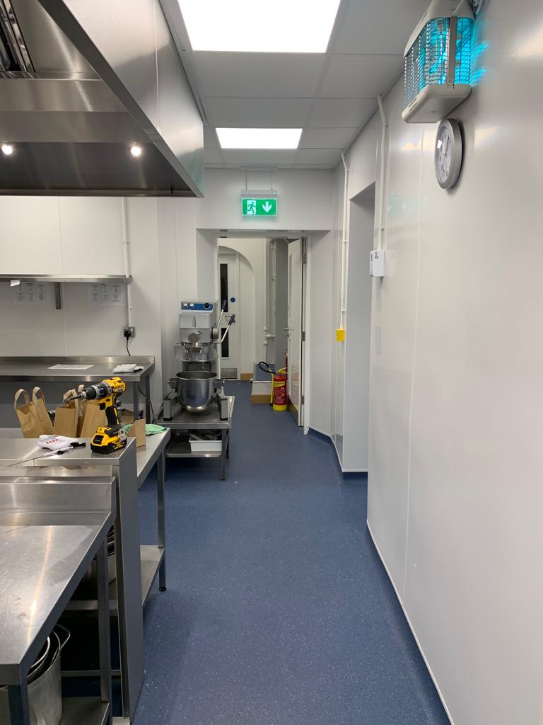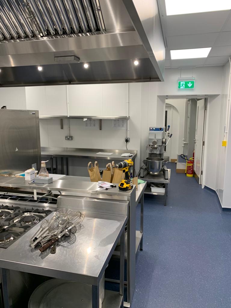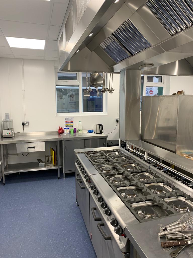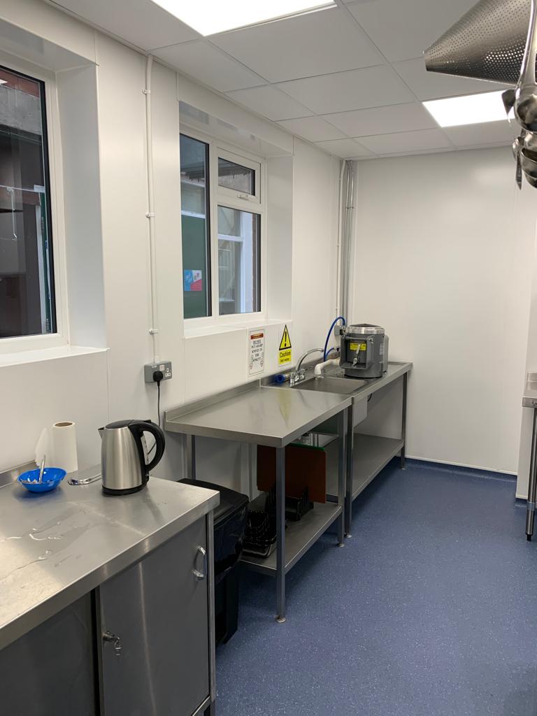 Full Kitchen replacement consisting of all new flooring, all walls cladded in new white hygienic wall boards , All new ceilings , full new extraction ventilation along with all new appliance's. Totally transforming the old unused kitchen and replacing it with a new fully equipped working kitchen and dinning room for the school. all new Mechanical and electrical services to the kitchen, store, offices and dinning areas. All new ceilings throughout. New access ramp to the dining areas.