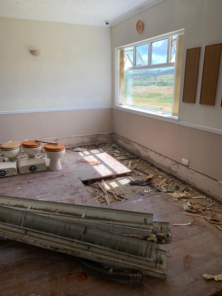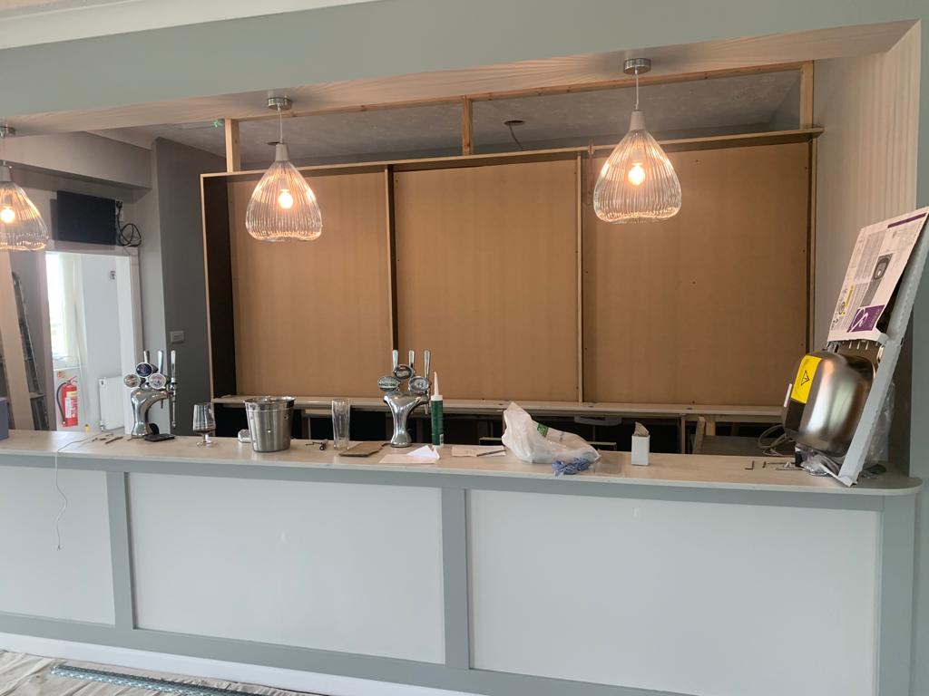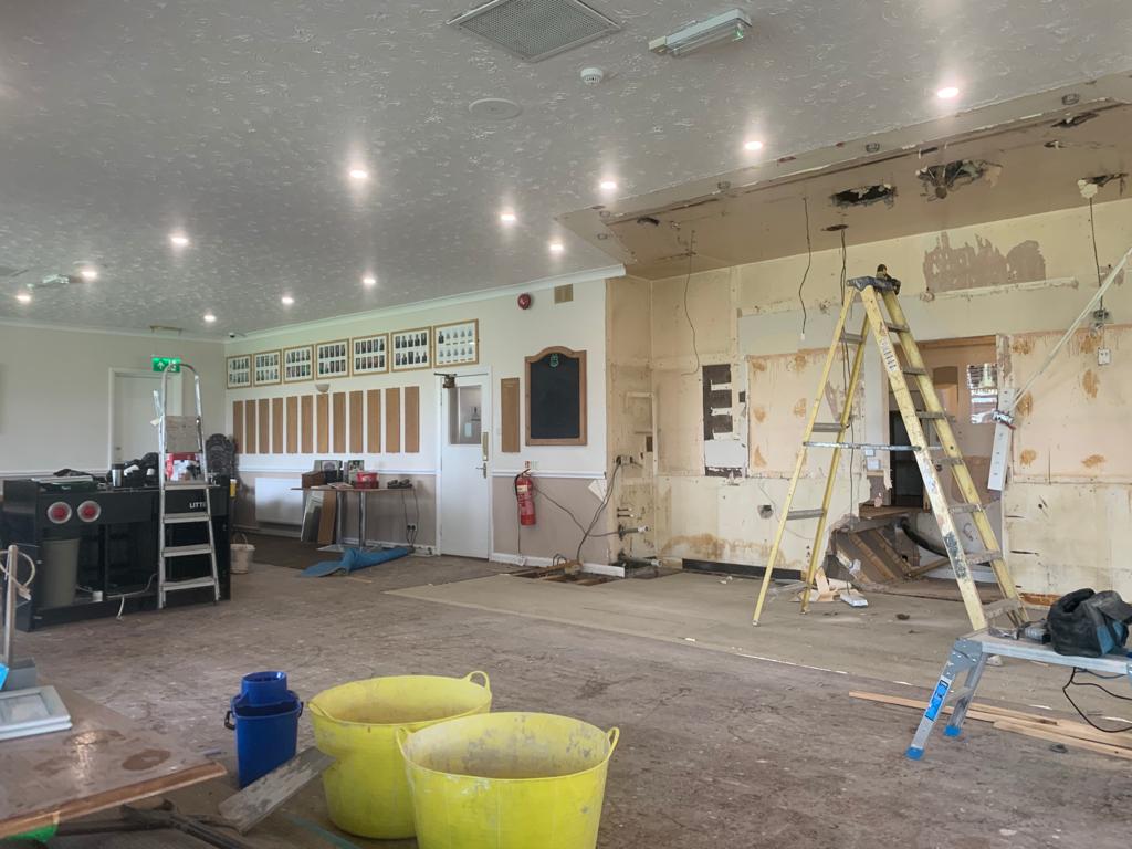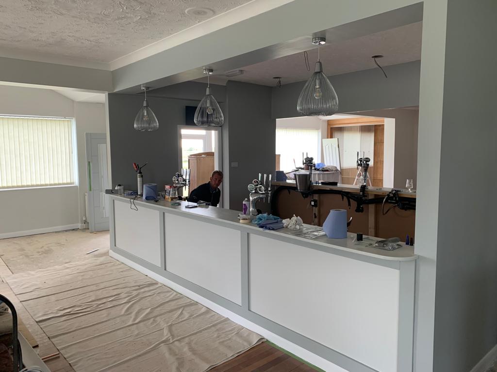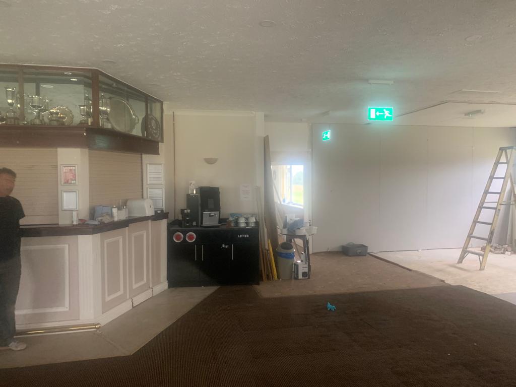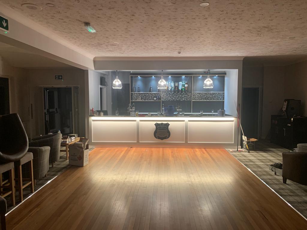 Total removal of the existing bar, Due to water damage along with full removal of the existing ladies toilets, and party walls. Construct a new toilet block with all fixtures and fittings . Construct a new double sided bar. One for members and one for visitors, In a new location that gives both members more space throughout. Working to ensure that the areas would be more welcoming to all to enjoy. all new interiors , Finishes and flooring completed to complete the transformation from what it was to what it is today.